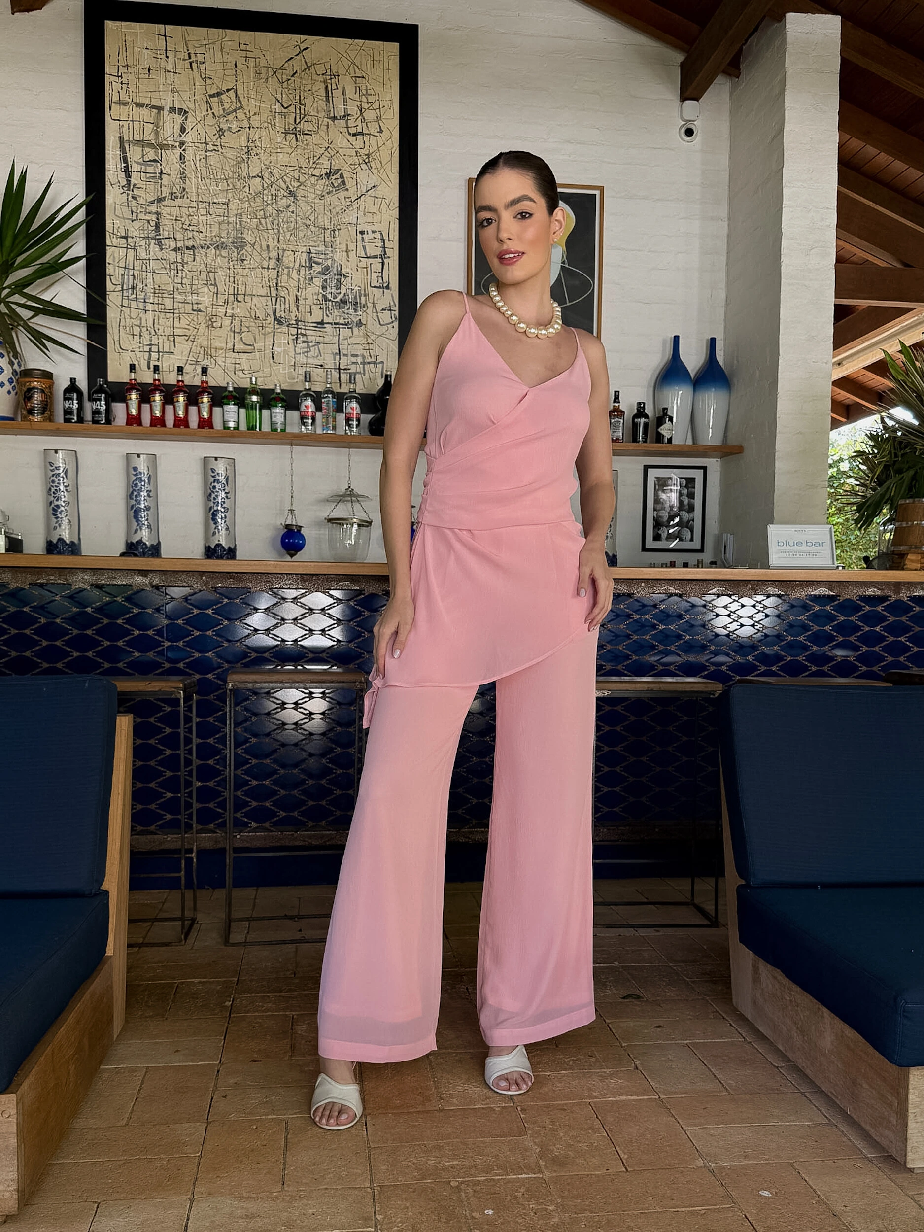 Conjunto Bella, em um tom rosa suave, ele entrega feminilidade e sofisticação na medida certa.A blusa possui alças finas e decote transpassado, que valoriza o colo de forma delicada. O detalhe drapeado na cintura cria um efeito visual elegante, definindo a silhueta com sutileza. A calça pantalona traz fluidez e alonga a silhueta, garantindo conforto absoluto e um caimento impecável!