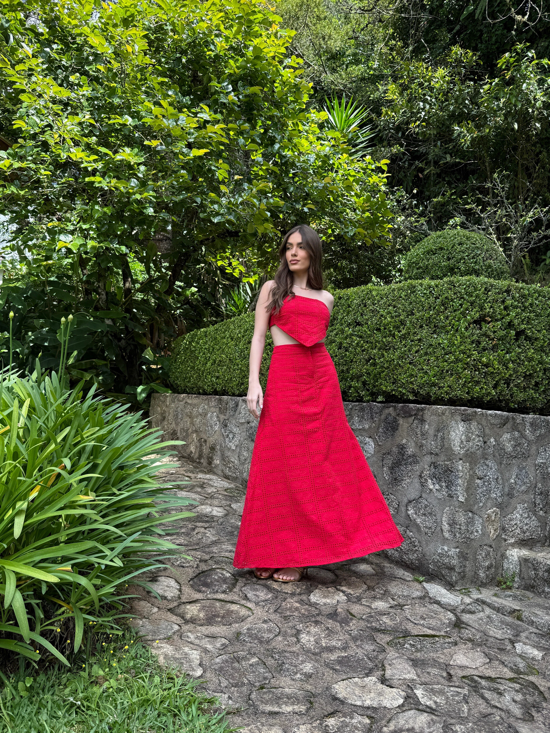O top é estilo lenço, com recortes laterais que valorizam o busto e criam um visual sofisticado e atual.A saia longa, também em laise trabalhada, é inteira forrada, garantindo total conforto e zero transparência. Seu caimento alonga a silhueta.Um conjunto marcante, feminino e extremamente bem construído, perfeito para quem busca qualidade, presença e estilo em uma única produção.