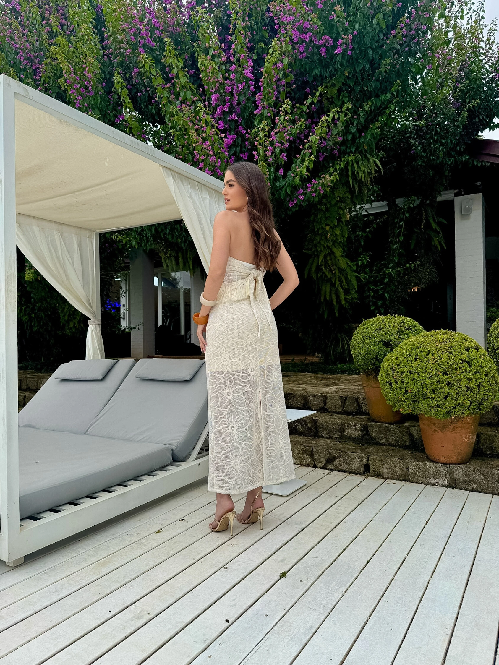 A renda tem toque macio, caimento fluido e um visual. O top estilo lenço possui estrutura suave e conta com franja aplicada na barra, que acompanha também a parte inferior do top, criando continuidade, movimento e um efeito super moderno. É aquele detalhe que eleva a peça para um nível mais fashion. A saia midi mantém o mesmo tecido de renda floral, com forro estratégico para garantir conforto e deixar a transparência na medida certa. O conjunto une textura, fluidez e sofisticação, perfeito para sunsets, eventos ao ar livre, celebrações elegantes e viagens onde você quer transmitir presença e charme com naturalidade.