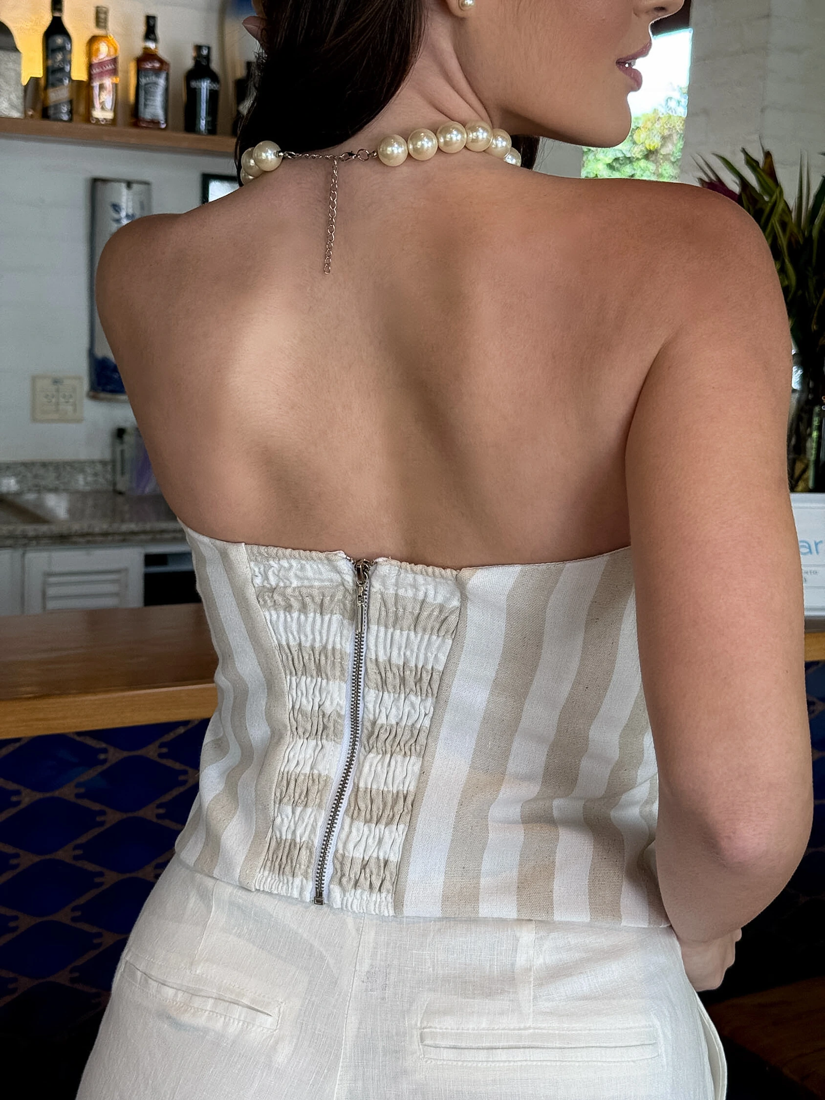 Blusa Isabel confeccionada em linho misto, o top traz textura leve, caimento estruturado e aquela elegância natural dos tons neutros listrados. A peça é inteiramente forrada, garantindo conforto e zero transparência.