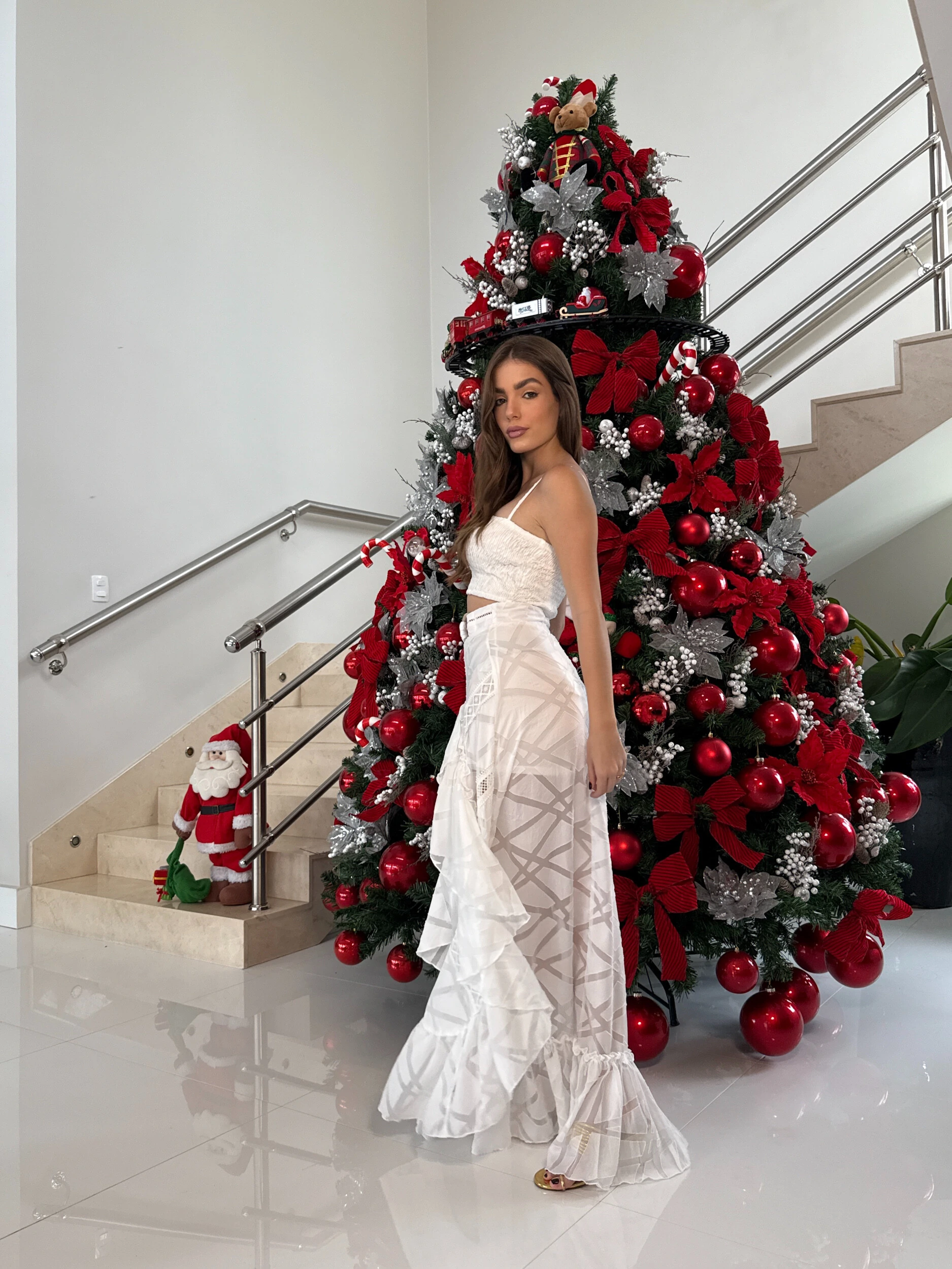 Conjunto Ivy, ideal para mulheres que amam o clássico look branco com um toque de modernidade. O top é totalmente confeccionado em lastex, o que garante um ajuste impecável ao corpo, conforto extremo e um visual moderno e delicado. As alças finas com regulagem completam o design minimalista e elegante. A saia longa traz um mix sofisticado de recortes, transparências e rendas, criando um visual leve e cheio de movimento. A modelagem fluida combina babados e texturas que valorizam a silhueta e entregam um toque romântico na medida certa.