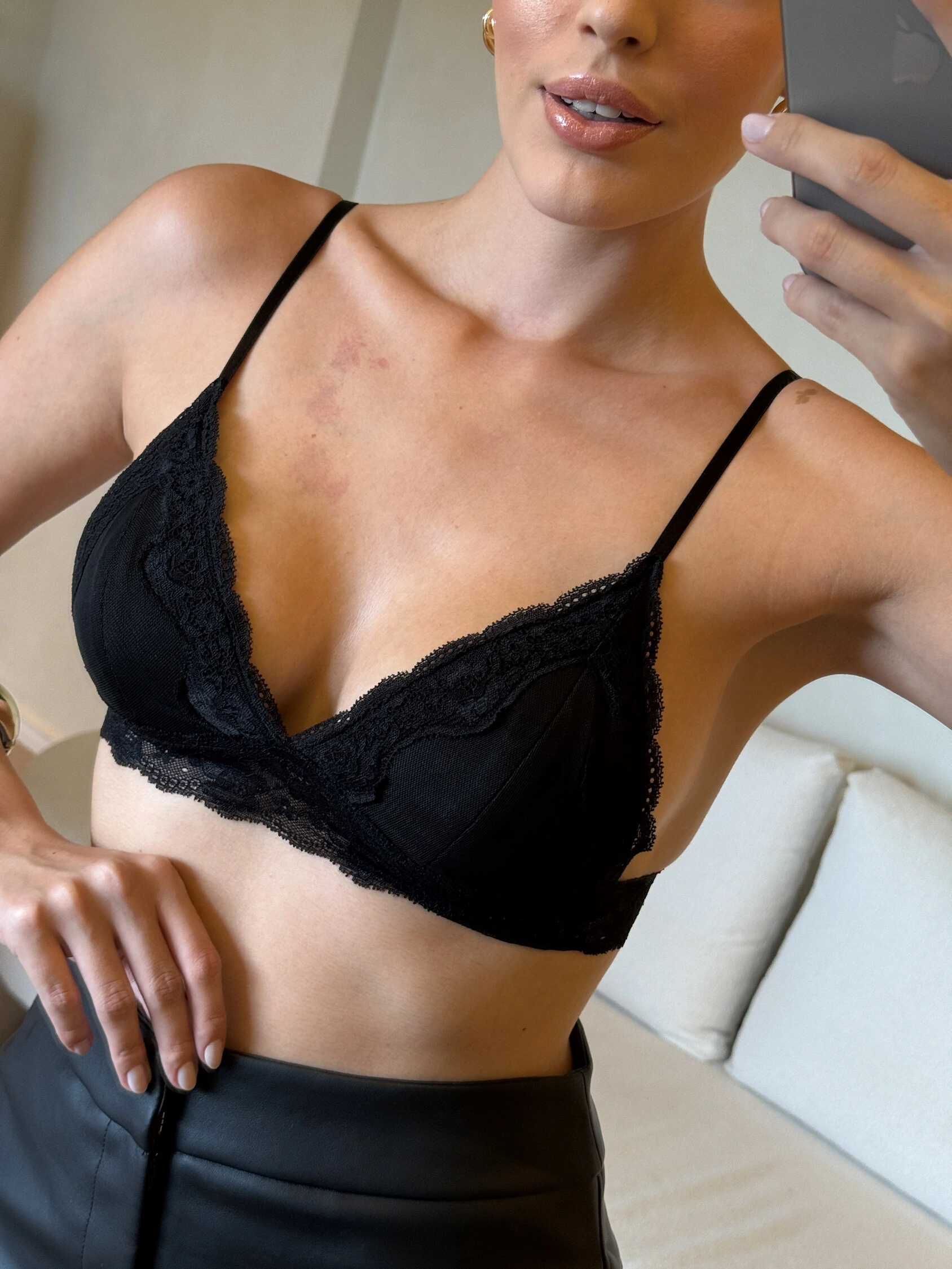 Top Mirna em renda possui bojo que valoriza o busto e garante sustentação na medida certa. O acabamento em renda traz um toque sofisticado e sensual à peça. Conta com alças reguláveis e fechamento por ganchos, proporcionando melhor ajuste e conforto ao vestir. Sua modelagem é maior, vestindo muito bem no corpo (a modelo veste PP e usa sutiã 42), evidenciando o excelente caimento e adaptação da peça. Perfeito para compor looks ou até mesmo como protagonista em produções mais modernas e elegantes.