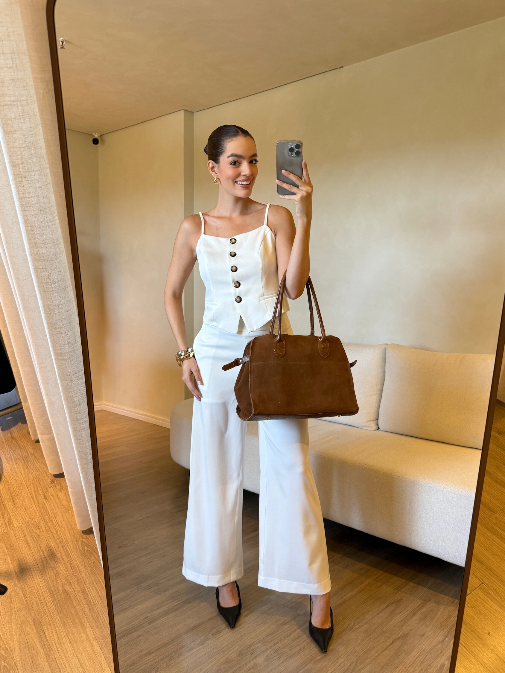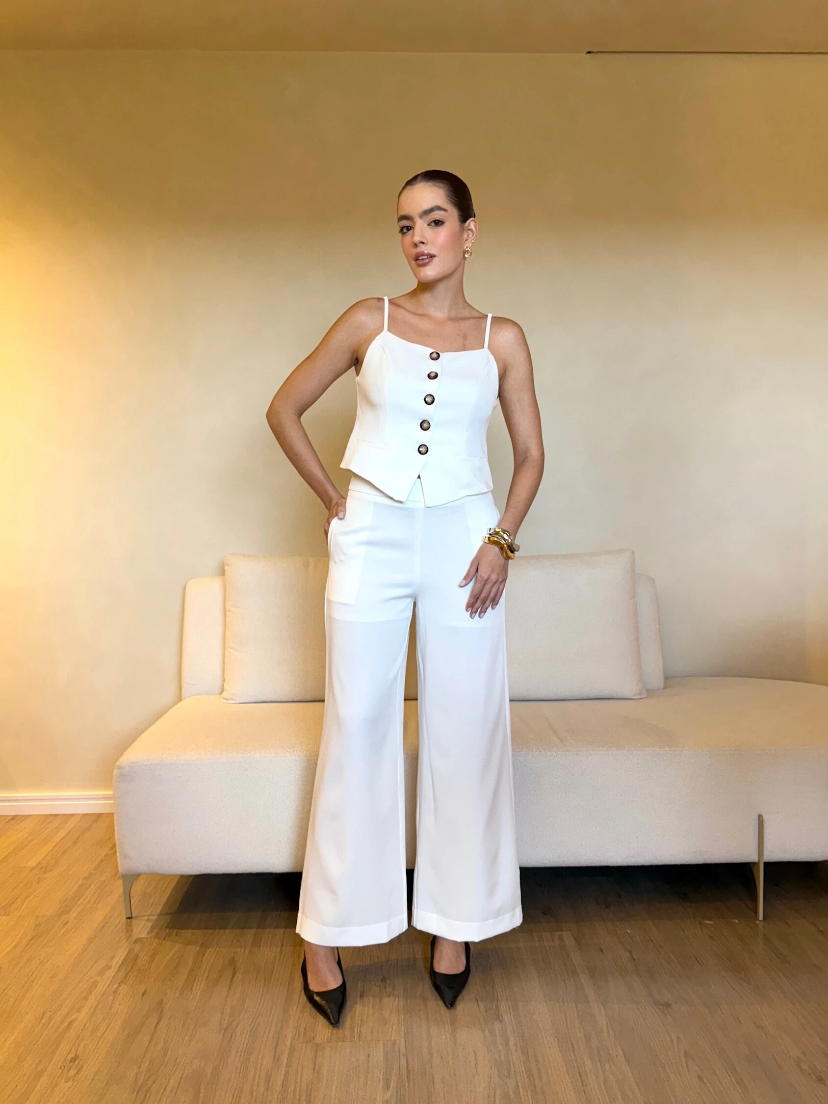 Conjunto Veridiana em alfaiataria com caimento elegante. O colete possui alças reguláveis, modelagem ajustada ao corpo e fechamento frontal por botões. A calça tem cintura alta, fechamento por zíper e modelagem ampla, trazendo fluidez e alongando a silhueta.