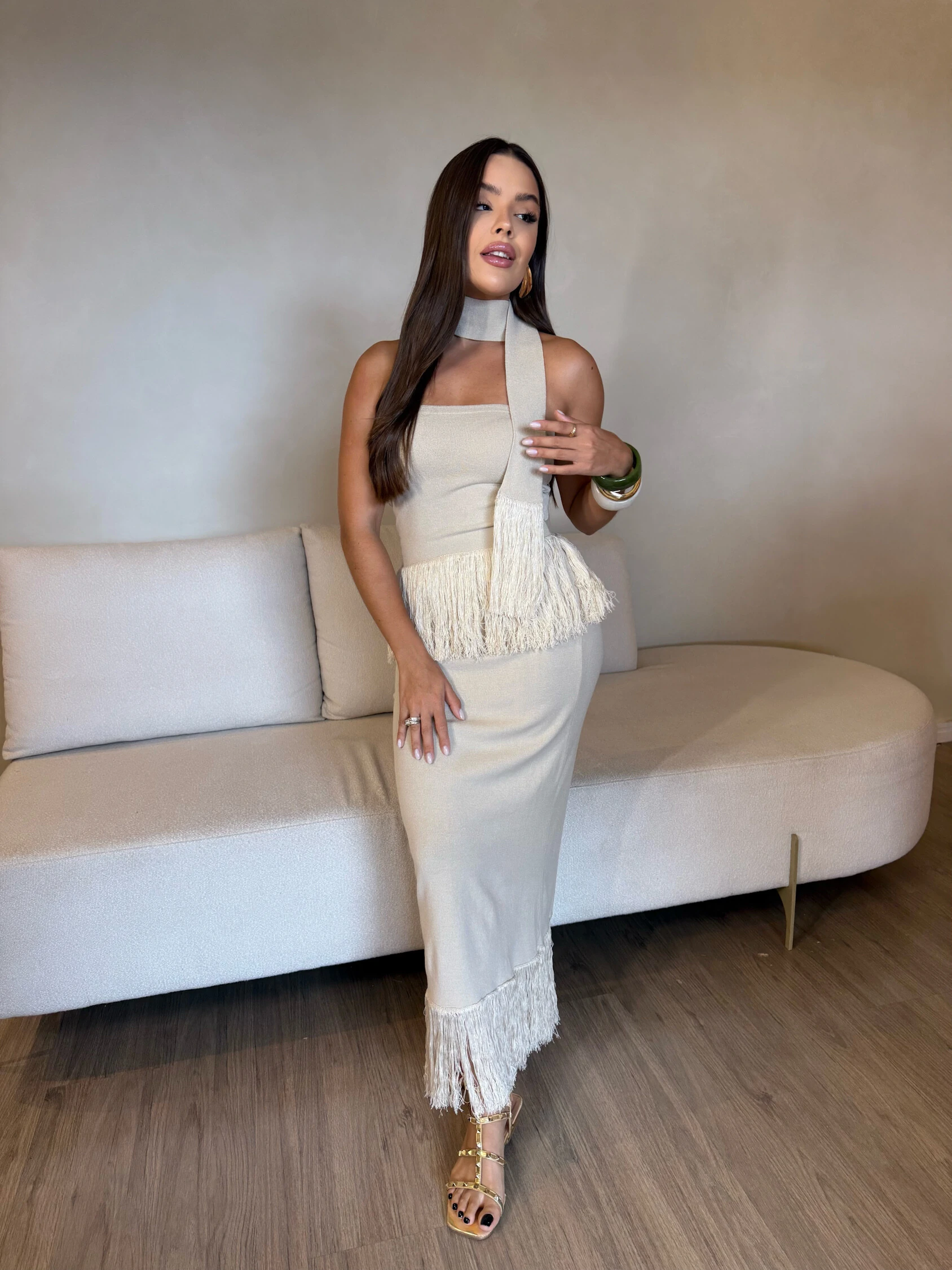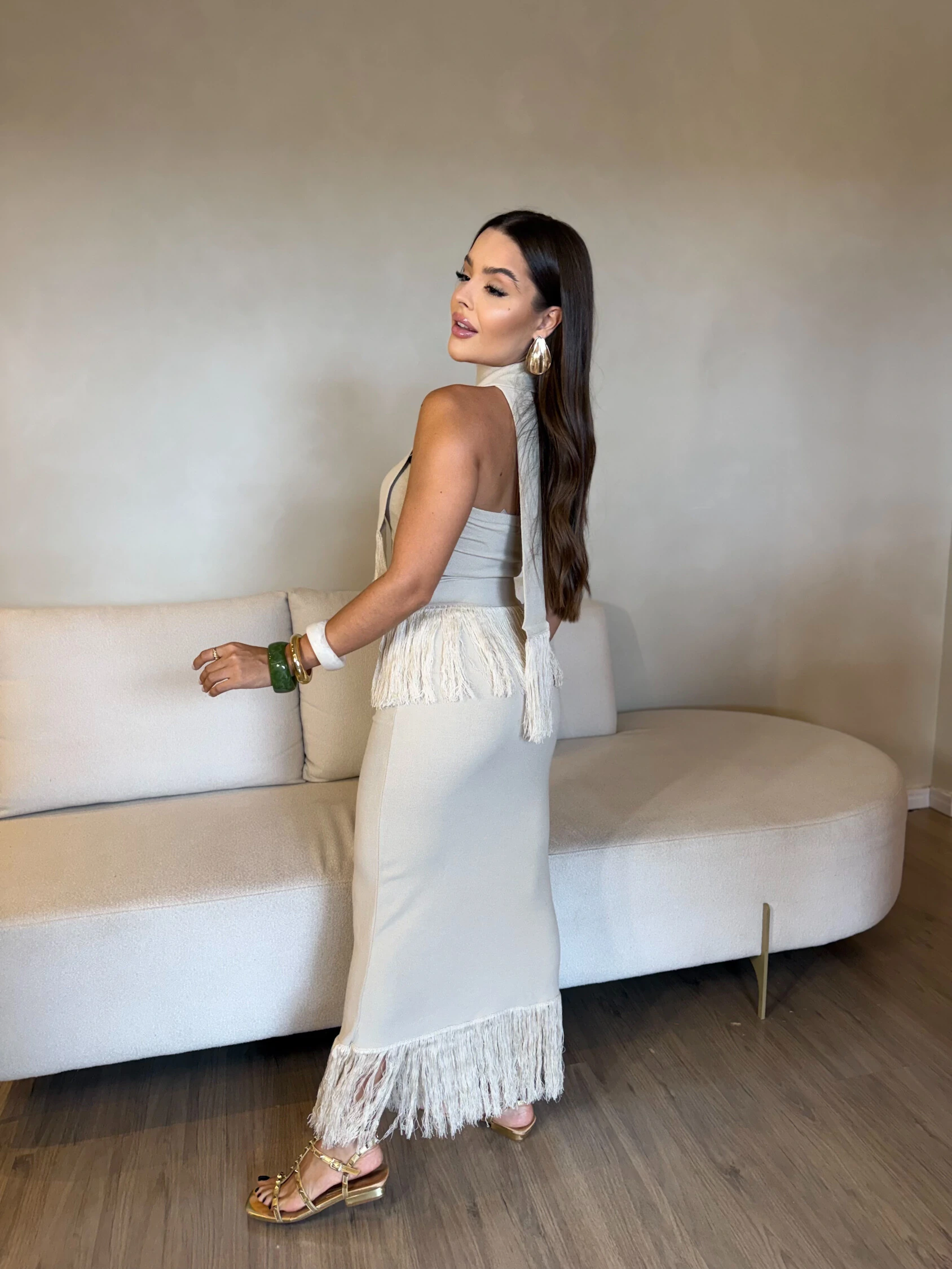 Conjunto Nalu com proposta leve e cheia de personalidade. A blusa tem modelagem ajustada ao corpo e acompanha uma faixa alongada que pode ser usada no pescoço, como cinto ou até mesmo de acordo com a criatividade da cliente. A saia midi acompanha a silhueta com conforto, e o destaque fica por conta das franjas aplicadas na blusa e na barra da saia, que trazem movimento e reforçam essa estética handmade, com aparência artesanal e rica em detalhes.