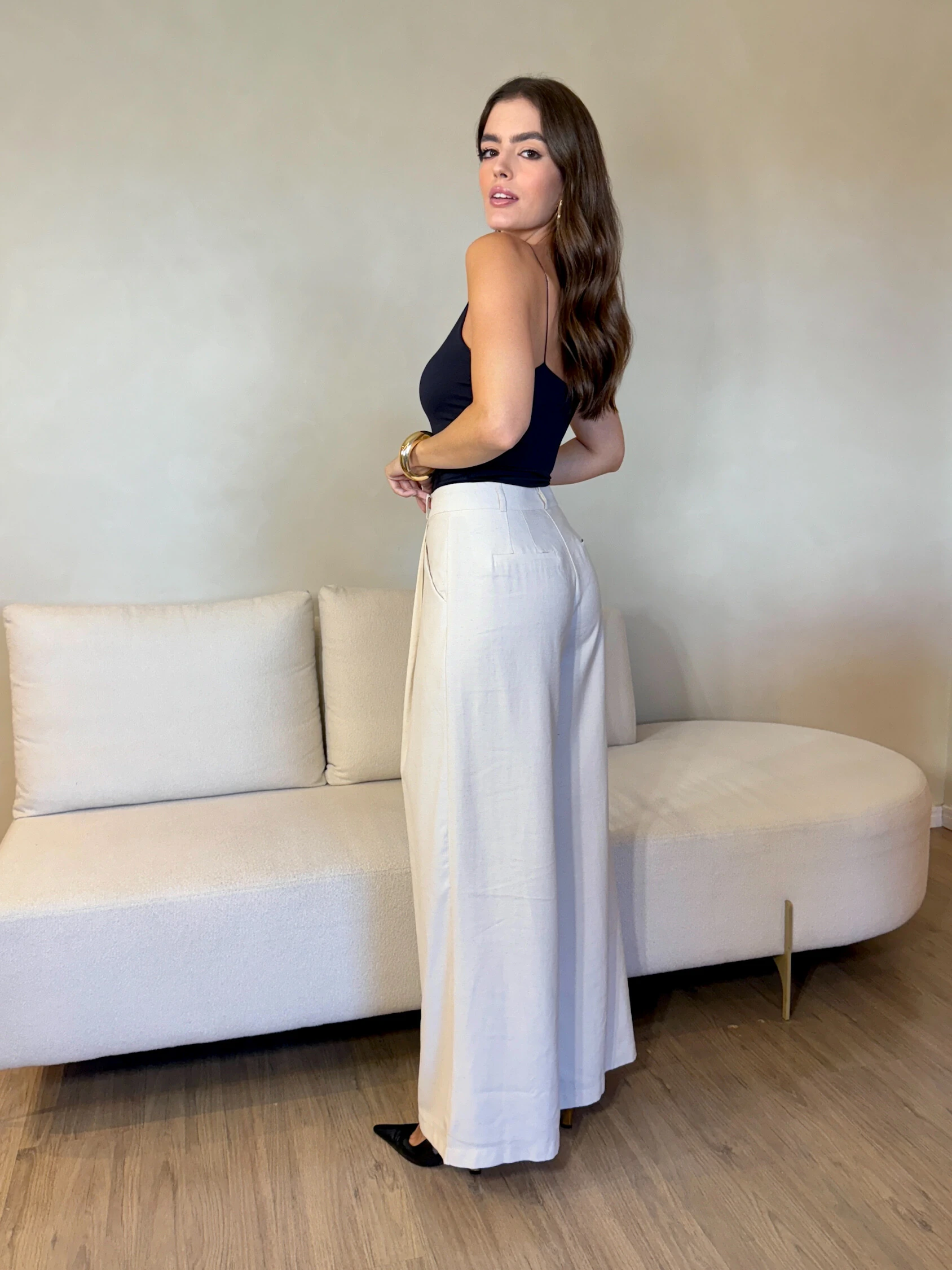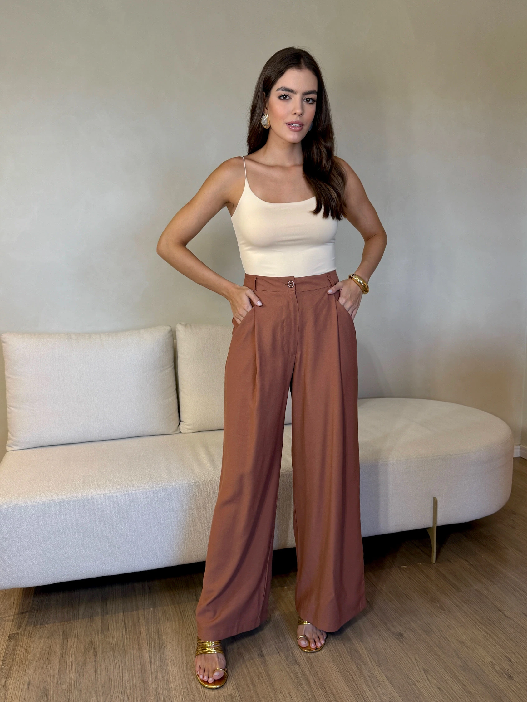 Calça Kelly de modelagem pantalona disponível no marrom, areia e off-white, com caimento fluido e elegante que alonga a silhueta. Possui cintura estruturada, pregas frontais e acompanha o cinto, que valoriza ainda mais a região da cintura.