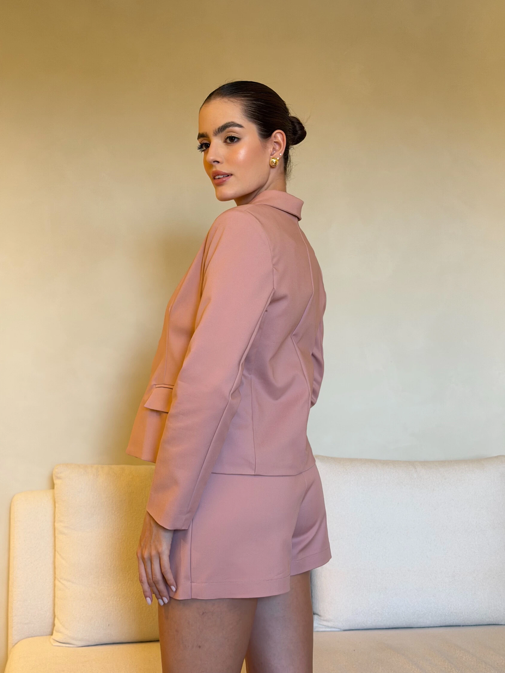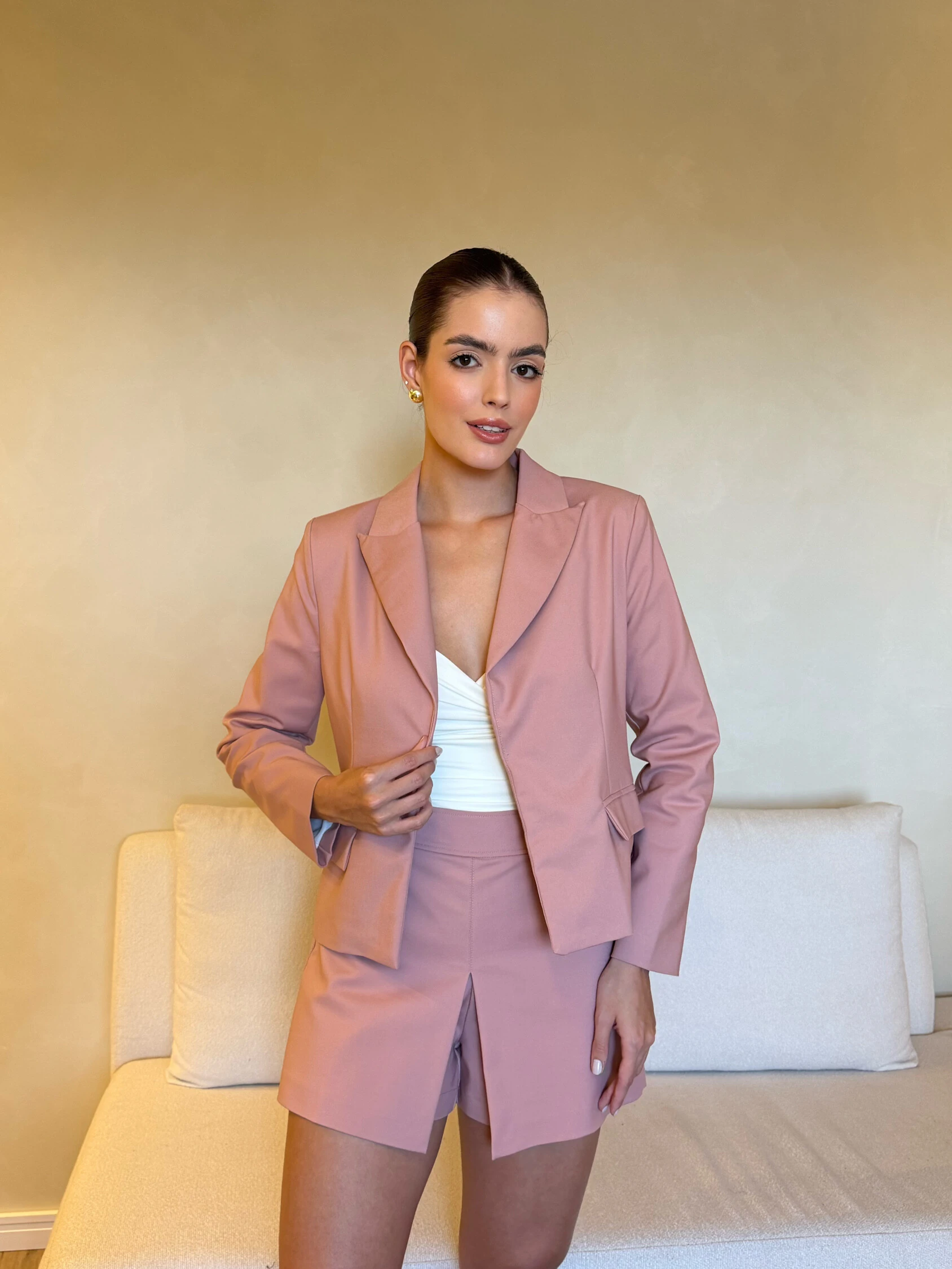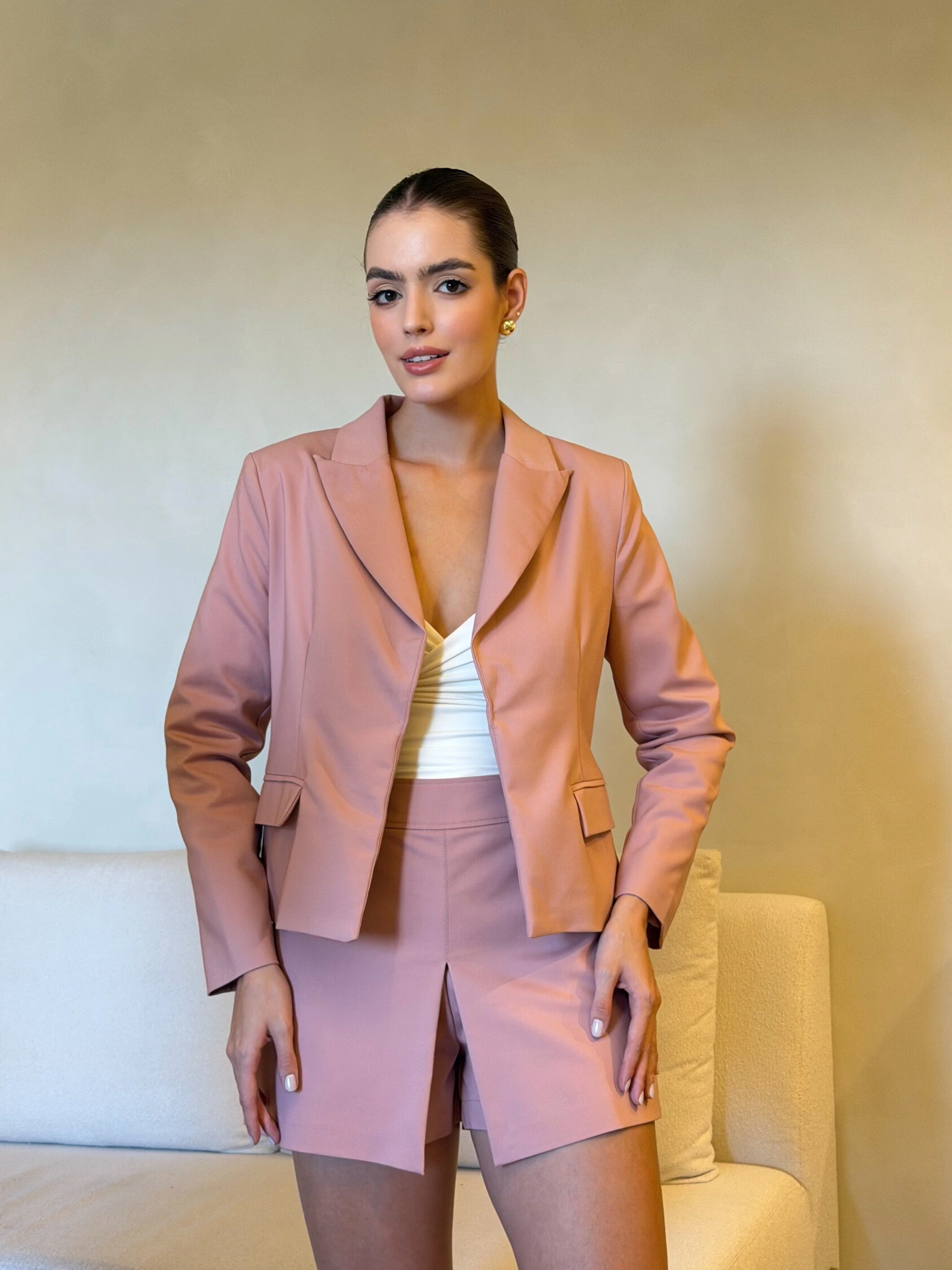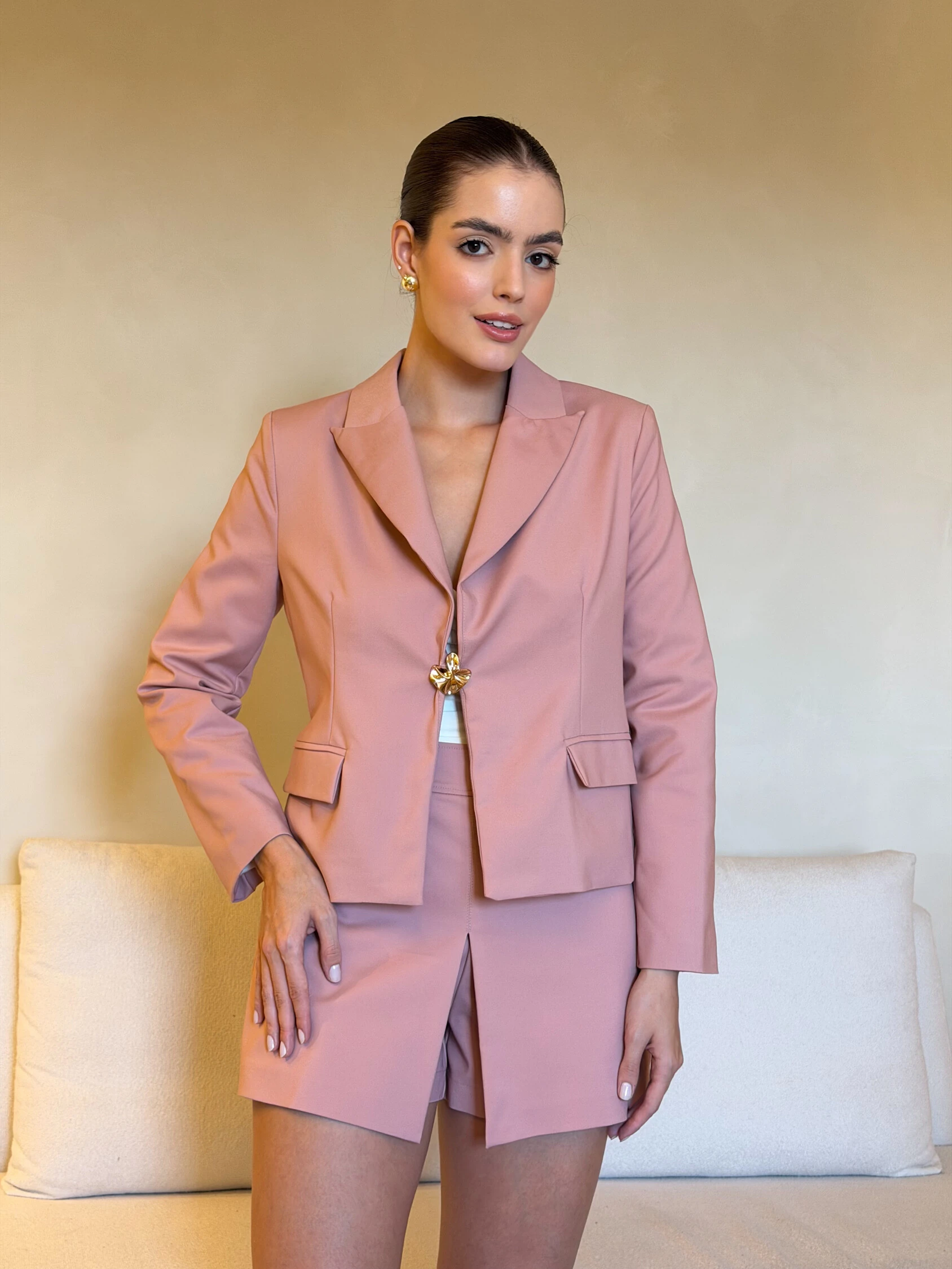 Conjunto Nanci em alfaiataria, elegante e versátil. O blazer é todo forrado, com corte estruturado e acompanha broche dourado, que pode ser usado na lapela ou para fechar a peça, deixando mais ajustada. A saia shorts tem zíper lateral, fenda frontal e shorts atrás, garantindo conforto e segurança. Perfeito para usar do dia com tênis até a noite com salto.