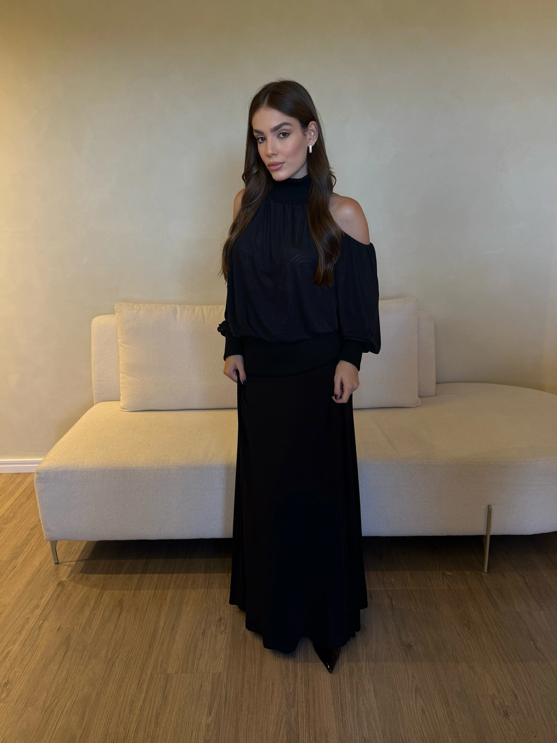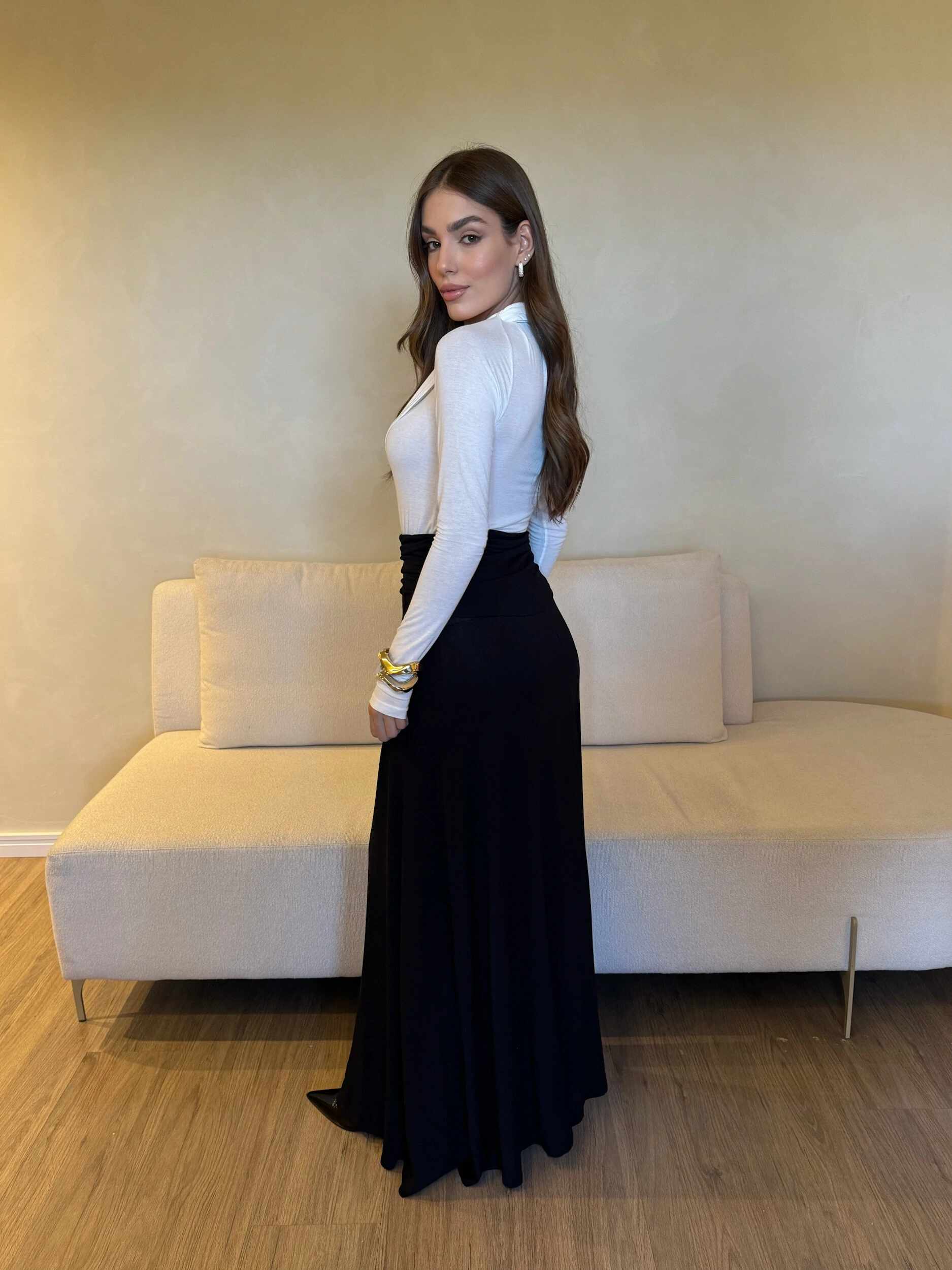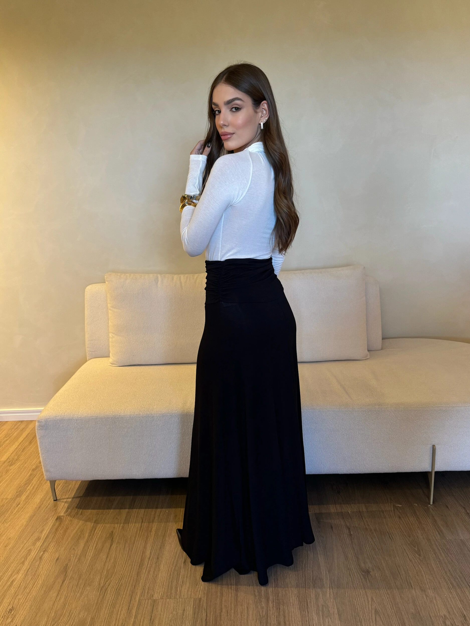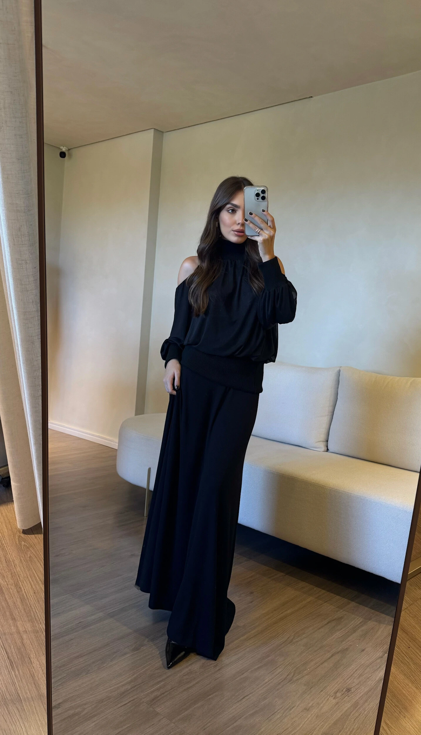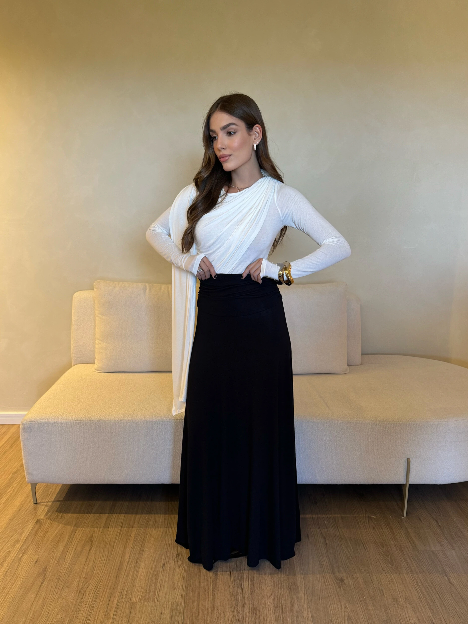 Saia Brume longa de cintura alta, com pala drapeada que valoriza o caimento na região da cintura. Possui modelagem fluida, proporcionando movimento ao caminhar. A pala mais larga permite também outra forma de uso, podendo ser posicionada mais alta no corpo e formando um vestido tomara que caia. A modelo possui 1,60 m e o comprimento funcionou bem nessa proposta como vestido.