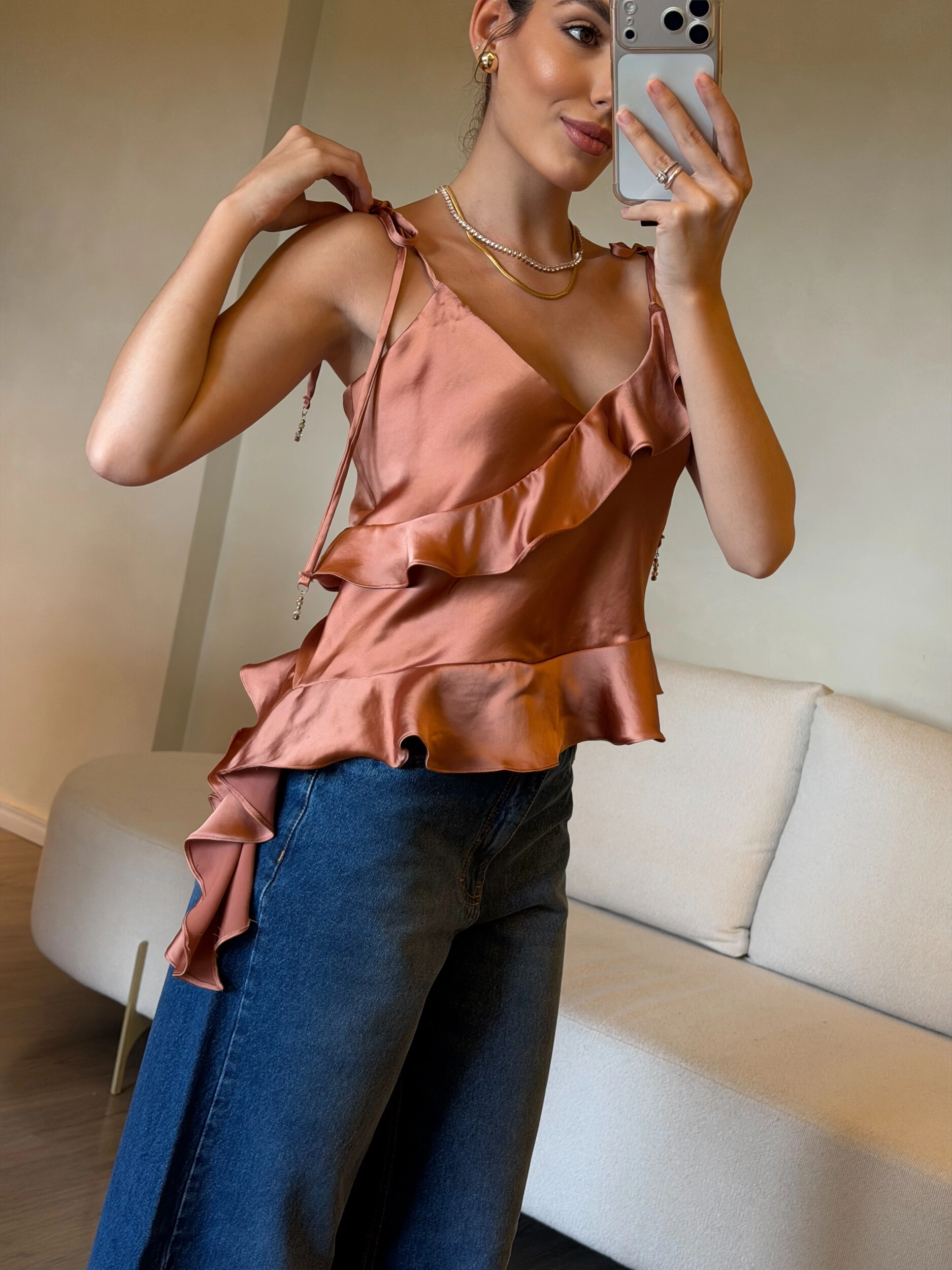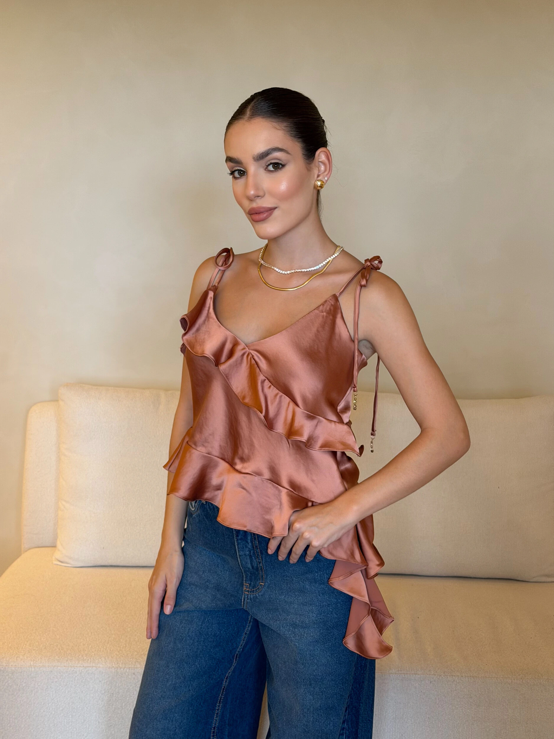 Blusa Mariah confeccionada em tecido acetinado de alta qualidade, com brilho sofisticado e caimento impecável. A modelagem assimétrica com recortes estratégicos e babados em camadas traz movimento e um acabamento refinado, elevando a peça. As alças com amarração possuem detalhe em pedraria, um diferencial delicado que agrega ainda mais valor e exclusividade. É uma peça pensada nos detalhes, com ótimo acabamento e toque premium.