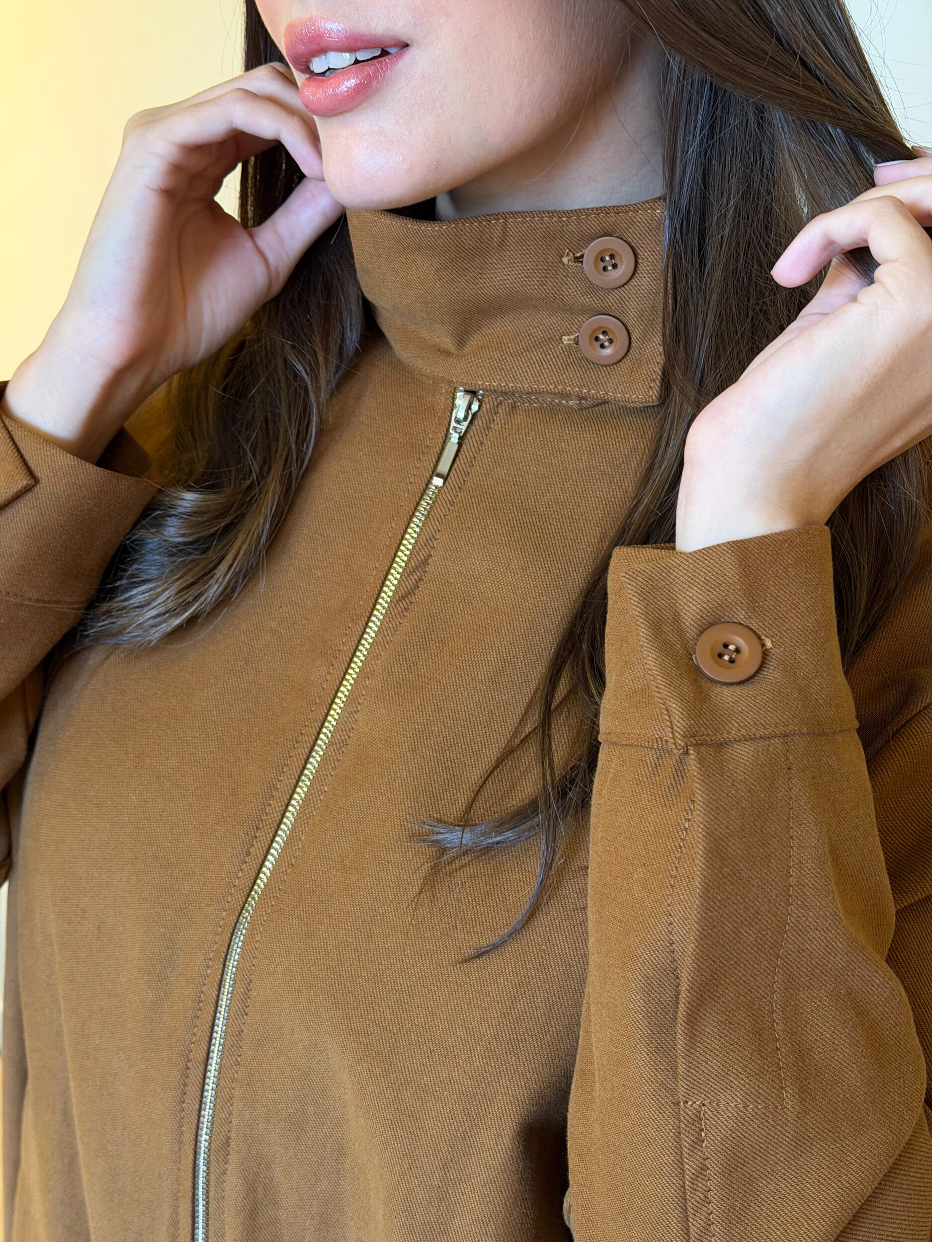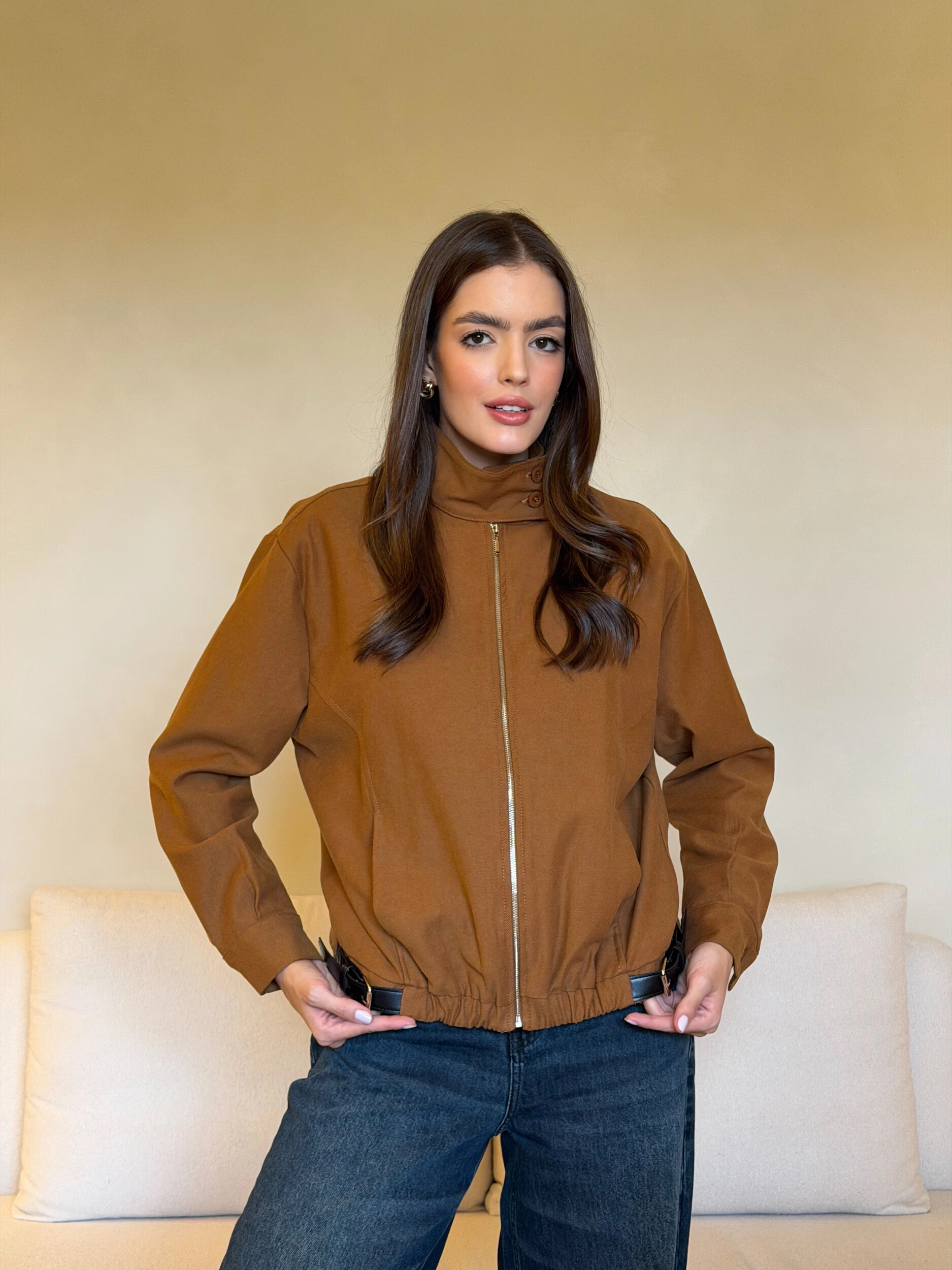 Jaqueta Susana moderna que une duas tendências fortes: gola alta estruturada, trazendo sofisticação, e fivelas laterais, que ajustam e valorizam a silhueta. Prática e estilosa, é a peça perfeita para elevar qualquer look.